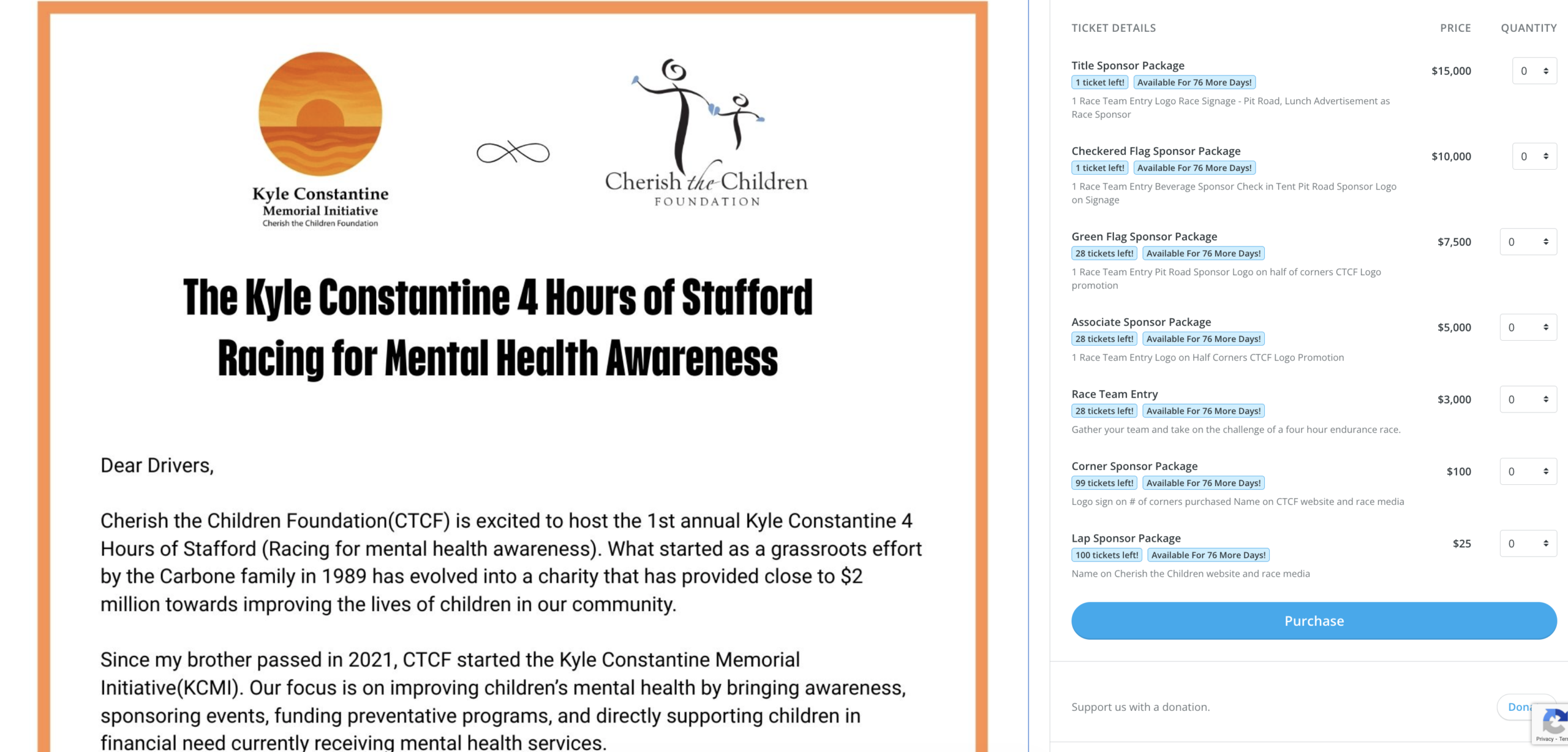 Cherish the Children Foundation is excited to host the first annual Kyle Constantine 4 Hours of Stafford (racing for mental health awareness). What started as a grassroots effort by the Carbone family in 1989 has evolved into a charity that has provided close to $2 million towards improving the lives of children in our community.